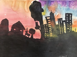 Grade 5 students learned about strategies that create a feeling of depth and space landscape genre. Student art featured original landscape form ideas with student's choice of silhouette landscape elements such as tress, animals, mountains or buildings. The students learned several drawing and watercolor techniques to achieve the effects of star-filled skies, such as wet-on-wet, salting, and wax resist.